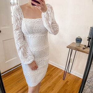 Features long sheer lace sleeves, elastic shoulders with slight puff, elastic cuffs, square neckline, lined, knee length, exposed gold back zipper, rose motif white lace