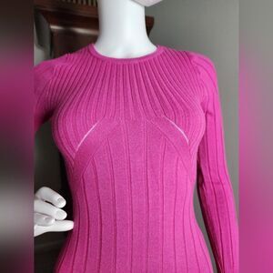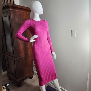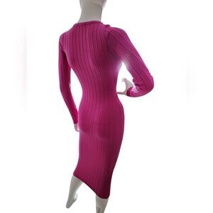 This elegant pink ribbed knit dress offers a sleek and stylish look. Perfect for any occasion, it combines comfort with a flattering fit.