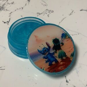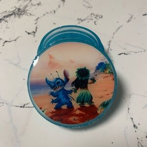 An ocean blue Lilo and Stitch grinder featuring an image of Lilo and Stitch. The grinder itself might be adorned with ocean-themed accents like seashells, starfish, or palm trees. With a durable construction and precision grinding mechanism, it would be perfect for any fan of the beloved Disney movie.