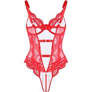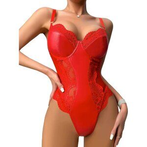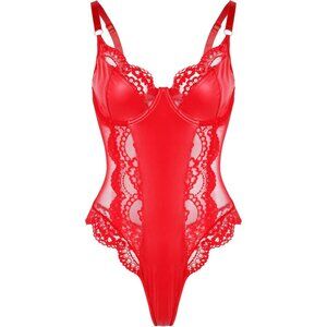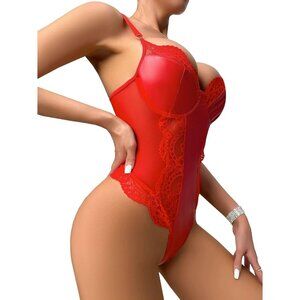 Lilosy Red Leather Underwire Push Up Lace Sheer Corset Teddy Bodysuit Women