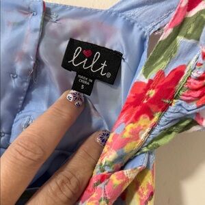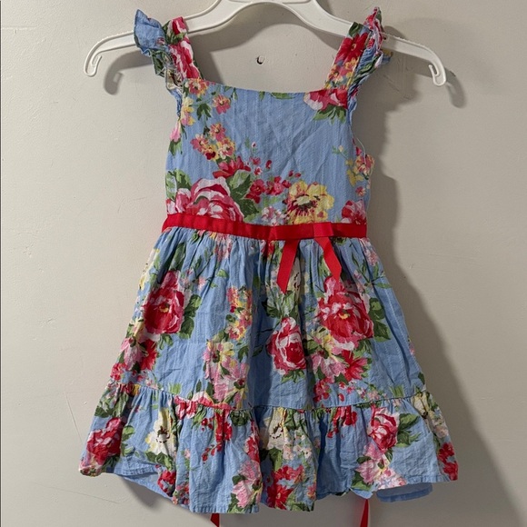 Adorable Lilt dress with a blue floral design. Features a bright red ribbon at the waist. Ideal for casual outings.