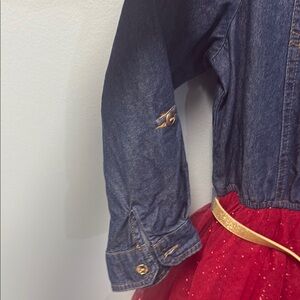 This unique jean dress from Lilt features a classic blue denim design with a playful red tulle accent. The 3/4 length sleeves and gold chain detail add a touch of elegance to this versatile piece. Perfect for adding a pop of color and style to any outfit.