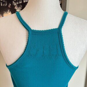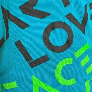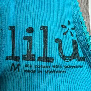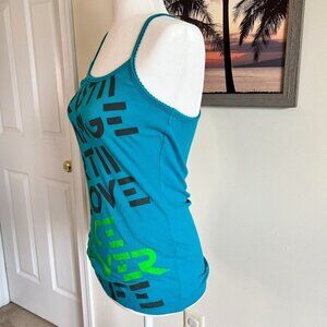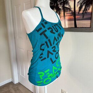 Lilu racer back tank top. Size medium. Teal tank with gray and green word graphic across front. Words on front are: "truth, change, earth, love, peace, forever, life." Cotton/polyester. Y2K style.