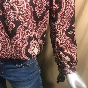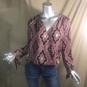 Lily Black Small V Neck High Low Blouse Long Sleeve Tie Cuffs Boho Top Pink Black