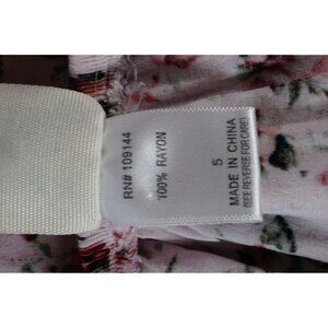 The dress has a ruffled neckline trimmed with pink lace and a decorative pink flower on the left shoulder. The is made of a 100% lightweight Rayon fabric.