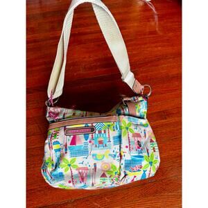 Measuring at 10.5 in x 7 in x 3 in, this small shoulder bag has enough space for your essentials. The beige handle/strap, silver hardware, and pink lining complement the multi-colored exterior, giving it a fun and playful look. Complete with an interior pocket, this Lily Bloom purse is the perfect addition to your collection.