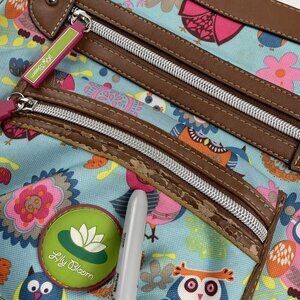 Lily Bloom Crossbody Purse Owls Medium Size Blue Brown Polyester Canvas