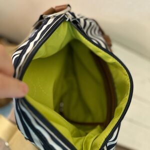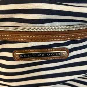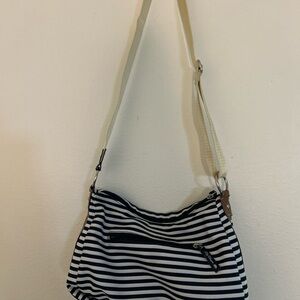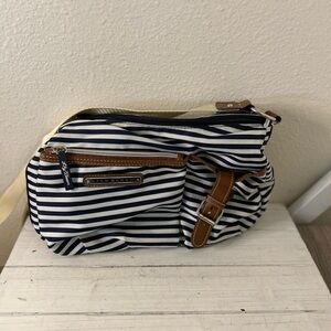 Stylish crossbody with navy and white stripes. Features brown buckle accent. Perfect for everyday use.
