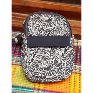 Very cute little, 6x4, Lily Bloom wallet or cell phone holder. My phone measures 6 inches by 3 inches and it fits in the back and center pocket. The purse has three separate pockets that all zip closed. The front pocket is smaller than the back two. No straps are included but it has the hooks to attach one. There is also an elastic band across the back. Pretty blue and white leaf pattern. Clean and in very good condition.