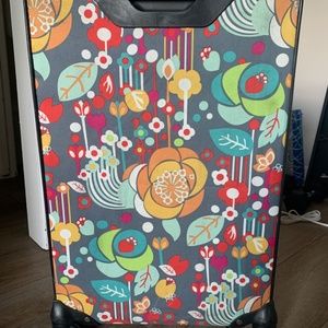 Medium wear on leather rims, but the wheels and fabric are in very good condition. Interior in perfect condition Very sturdy and spacious suitcase with 3 outside pockets that fit more than you think. Two inside compartments and buckles that keep clothes in place in the main compartment. Pretty and unique design so you won’t mix it up with someone else’s at the airport. Only used a few times, is a good option for a kid or teen.