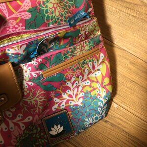 Lily Bloom cross body colorful spring-color flowery prints, zipped main compartment, front two pockets, back pocket with snap button, measures 10 x 10 x 1, wide size shoulder strap, shoulder drop measures 22"