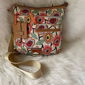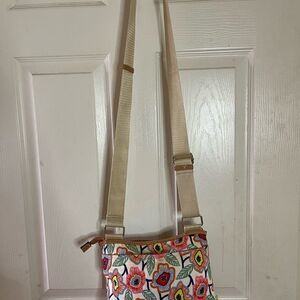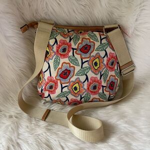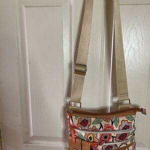 Lily Bloom floral multi color floral nylon crossbody bag tan faux leathe…