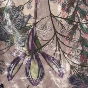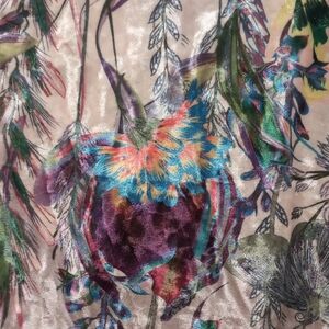 Chic velvet cardigan with a colorful feather pattern. Features a hood and stylish buttons.
