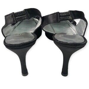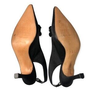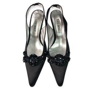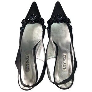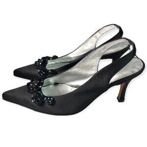 Lily Holt Vintage Black Satin Beaded Pointy Slingback Pumps