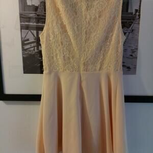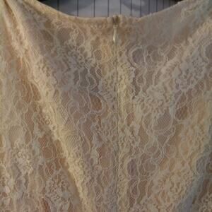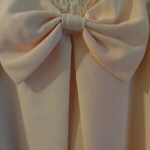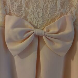 Beige scooped neck tank dress features floral lace design to the waist with zipper, attached bow and skater skirt.