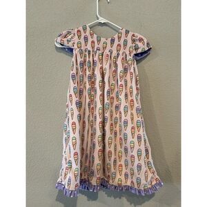 This delightful multicolor girl's dress offers two fun looks in one with a reversible design featuring a playful ice cream cone print on one side and a charming polka dot pattern on the other. The soft, lightweight fabric and short puffed sleeves ensure comfortable wear, while the button-down front and ruffled trim add sweet details. A versatile and stylish choice for everyday fun.