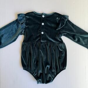 Size 12-24 months, Lily & Max long sleeve rustic green one-piece velvet bubble romper. One in cursive rhinestone decal on chest. Perfect for 1st birthday party, photos or Fall outfits. Snap closure between legs. Buttons up the back. Soft and perfect for your sweeties first birthday! No stains or flaws, very good used condition.