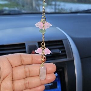 Rear view Mirror Decoration Beautify your car with this elegant rear view mirror charm, designed with high-quality materials such as the lovely rose quartz, known for its properties of love, peace and protection. This accessory not only adds style, but also fills your space with positive energy and harmony. Ideal for those looking to combine spirituality and decoration in a unique accessory.