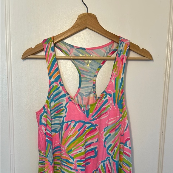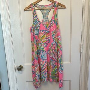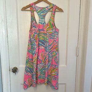 Bright pink sleeveless dress with a vibrant multicolor pattern. Ideal for summer outings or a beach coverup