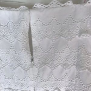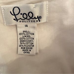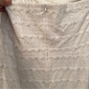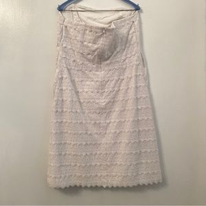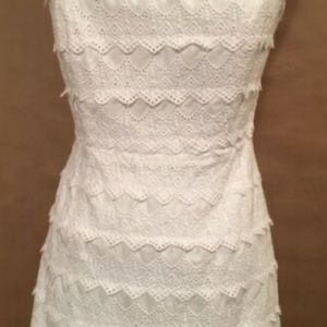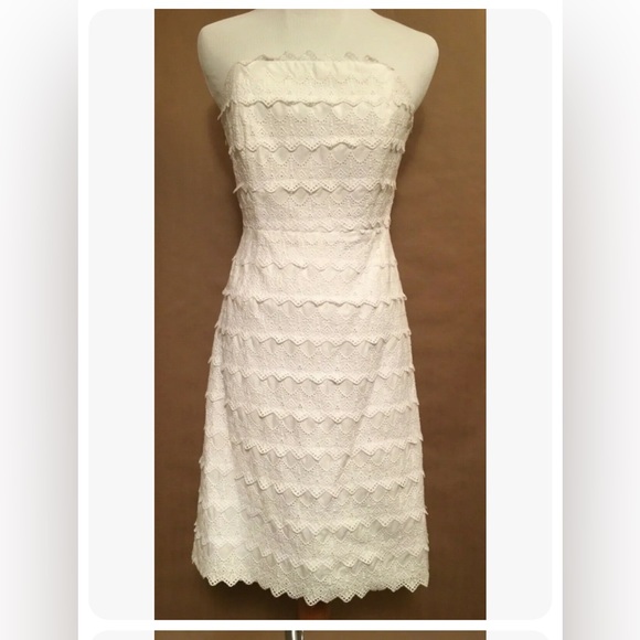 Lilly Pulitzer, this delightful strapless white embroidered lace dress is fitted and fun. Perfect for formal and casual events, both. It has stays and edging at the top to keep it in place. The dress closes in the back with a zipper, hook and eye.