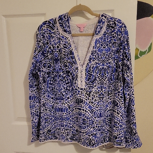 Stylish blue and white Lily Pulitzer vne k, pullover, long sleeve hoodie with intricate patterns. Perfect for casual outings or a day at the office. 24" pit to pit and 25" length A27