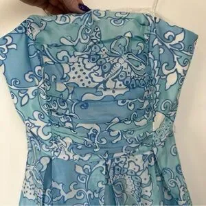 Look stunning in this beautiful Lily Pulitzer Angelette dress. The dress features a gorgeous blue and white silk fabric with a butterfly and floral pattern that is perfect for any occasion, especially for wedding guests. The dress has a strapless design with a pleated and ruched accents that add a touch of elegance to the dress.