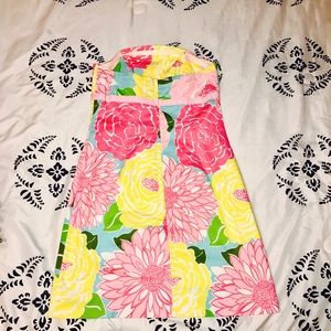 Beautiful, Strapless Lily Pulitzer Dress. ❤️ bright pretty colors. looks good to dress up or a day on the beach 🌊.