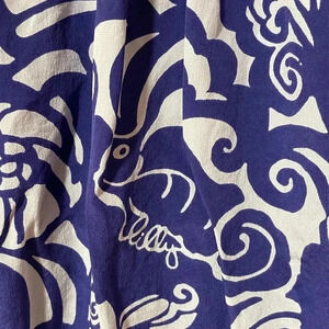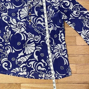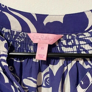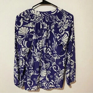 Excellent pre worn condition, lightweight purple Elsa top from Lily Pulitzer. Fun, summery fish print and lovely gold buttons. Small pulled stitch at collar, pictured. All items come from a golden retriever friendly, NS home and ship next biz day. 💕
