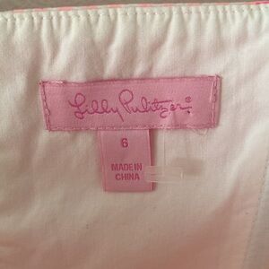 Lilly Pulitzer Lowe Dress Pretty Gingham. Strapless, allover gingham print, ruffle peplum waist. Size 6 Fiesta Pink Pretty Gingham. Never been worn. Exposed back zip closure with grosgrain trim, lined.