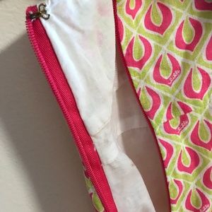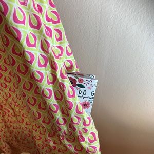 Features: Very cute sundress in an uncommon Lily Pulitzer geometric pattern, signed "Lilly" throughout the pattern. Green and Pink rain-drop like pattern. Neckline is like a mix between sweetheart and square. Front has small buttons down the front to slightly below the bodice, invisible zipper closure under left arm. Dress is fully lined (bodice and skirt), except for the straps. Pockets on both sides. Bottom of skirt is tiered with width increasing as you go lower. Snaps with ribbons on the inner side of the shoulders to hold bra straps hidden. Hits about knee-level based on how tall you are. Very feminine and bright, perfect to throw on and go to the beach or for brunch with friends.