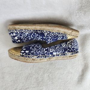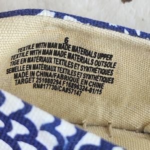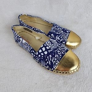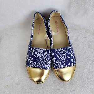 Brand: Lily Pulitzer Size: 6 Color: Blue White Gold Material: All Manmade Details: Almond Toe, Blue White Floral Print with Gold Covered Toe Upper, Espadrille Sole Slip On Comfort Flat Shoes