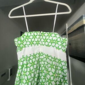 Dress is white with yellow center green flower print with white band under bust and white vertical band from neckline accented by 3 cream buttons.