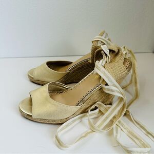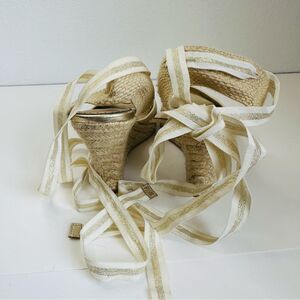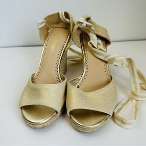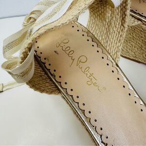 Lily Pulitzer Natural Gold Peep Toe Ankle Tie Up Straw Wedges Size 8