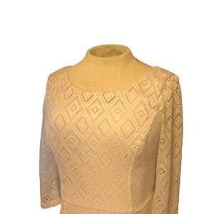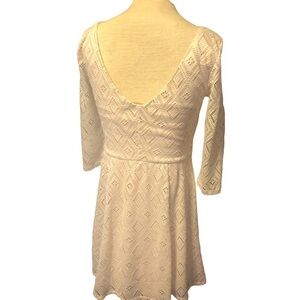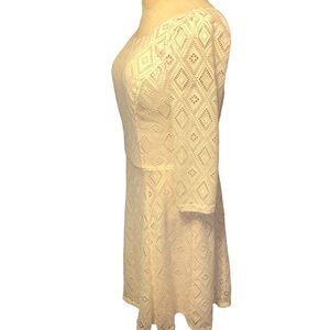 Lily Rose Bateau Neck Low-Back Dress Fit & Flared Ivory Lace Over Sand Size Small. Looks adorable with thick brown leather belt and boots or sandals. Looks great with tights and boots. Could even look great with tennis shoes. Very cute neutral and versatile piece. In excellent condition with no defects noted.