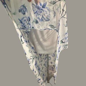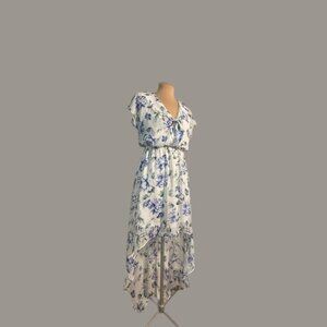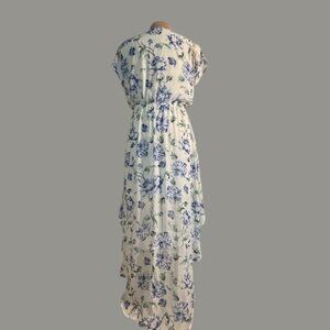 Lily Rose Blue and White High Low Sundress size small. Blue and white floral pattern, perfect for a wedding guest or resort wear. The dress boasts a flattering V-