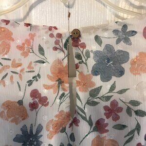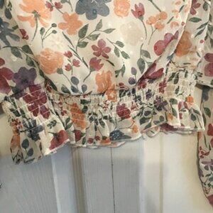 Super, Super cute floral, sheer crop top with long sleeve, elastic waist and sleeve hem. Back button closure. Size small.