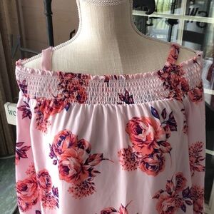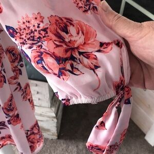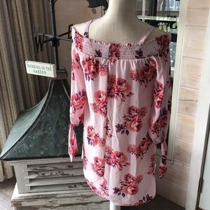 Lily Rose long top. Off the shoulder with adjustable straps. 3/4 sleeves. Shear flower print fabric with blush pink lining. Very flowing. Size Small. Smocking around shoulder to make it stretch to your size. P2P 18”. Length 34”. ( possibly could be worn as a dress) sleeves P2Cuff 12”. Like new condition. No stains or snags