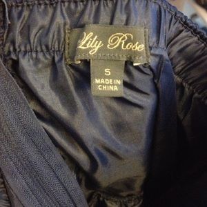 This navy blue dress was purchased from Macy's (Lily Rose brand) and worn 2 or 3 times. The top has a sweetheart neckline with rubber piping in the front to help hold it up, while the top of the back is elastic and has a zipper. There is a ribbon that ties in the back. The bottom is blue silk with a rose-patterned sequined sheer overlay.