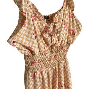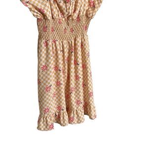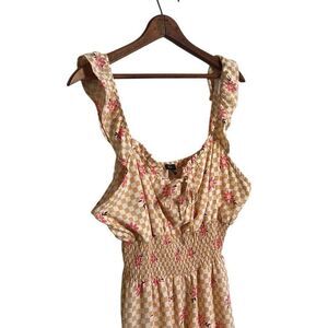 Charming mini dress with floral pattern. Features ruffled straps and smocked waist. Perfect for casual outings.
