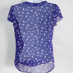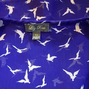 Lily Rose Sheer Top Women XS Cap Sleeve Blue Bird Pattern Casual