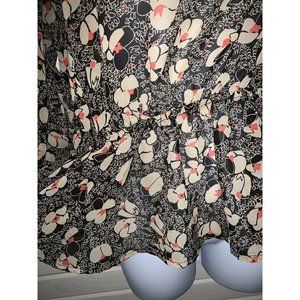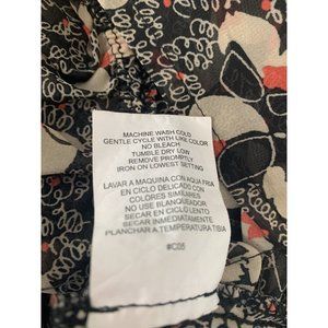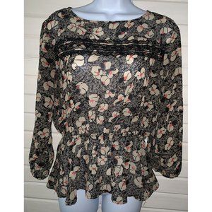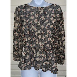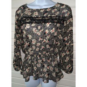 Lily Rose Sz MEDIUM Tunic Peplum Popover Black Scribble Floral Semi Sheer EUC