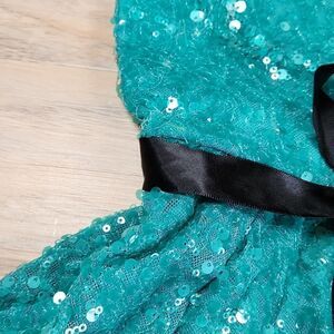 Lily Rose green sequined, one-shouldered, stretchy dress with black, removable satin tie at the waistline and a full liner. Has only one belt loop, as shown in the last photo