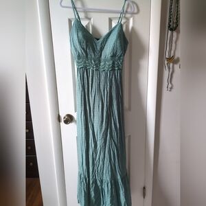 lily rose brand maxi, size xl. gorgeous turquoise teal color. fabric has swiss dot texture. crochet underbust. adjustable straps. elastic panel at back. hidden bust cups.