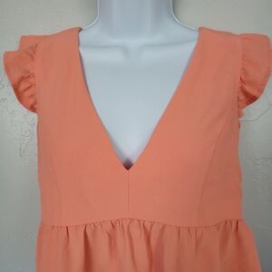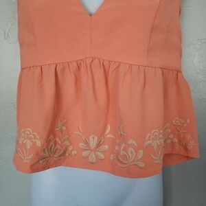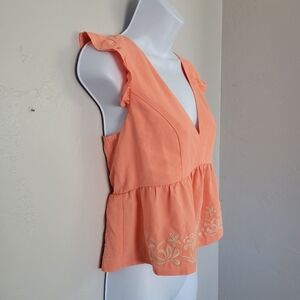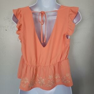 Lily Star Small Orange Blouse Plunge V-neck Floral Embroidery Peplum Cropped Top