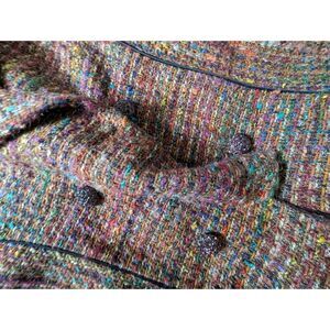 This is a vintage Lily & Taylor designer long line coat from the 1980s in a size 18. The coat features a double-breasted style with a tailored look, made from a wool blend material in a multi-color tweed pattern. This coat has crystal buttons, is a wool blend, and showcases original design and craftsmanship from the United States.