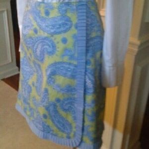 Baby blue yellow and white paisley skirt with ruffle trim at the bottom of the skirt