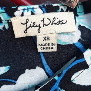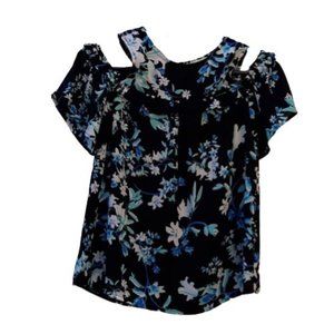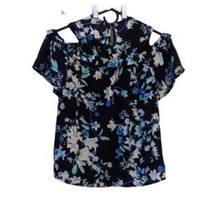 Lily White floral chiffon feel blouse. Black with blue and white floral, cold shoulder, ruffled bodice, bead button at back of neck, short flutter sleeves. EUC, no defects, smoke-free and pet-free.