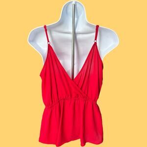 Peplum camisole in red with V-neck, adjustable spaghetti straps, and an elastic drawstring waist. Lightweight polyester with a soft drape. Y2K minimalist. Solid. Condition: Excellent.