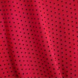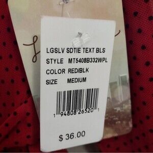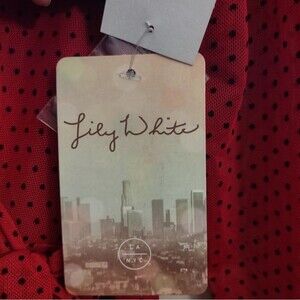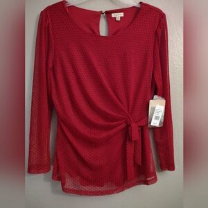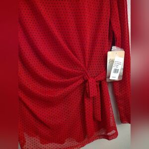 This beautiful Lily White long sleeve blouse features a vibrant red fabric adorned with classic black polka dots, this top offers a flattering silhouette with its side-tie wrap detail. Sheer overlay but fully lined bodice.vWith a keyhole button closure at the back, this blouse is both stylish and versatile. Great for work, casual outings, or a night out! Size: Medium