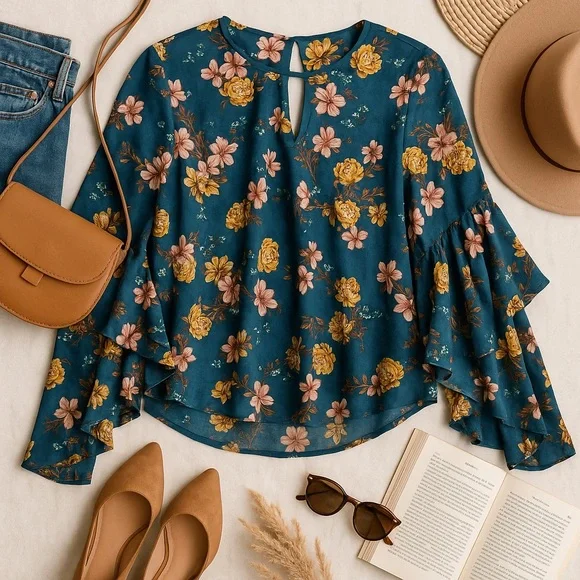 This Lily White blouse features a rich teal background with a vibrant floral pattern in shades of yellow, pink, and white. Designed with an airy, semi-sheer fabric and cascading ruffle sleeves, it offers a feminine, lightweight option suitable for both casual and dressier wear.